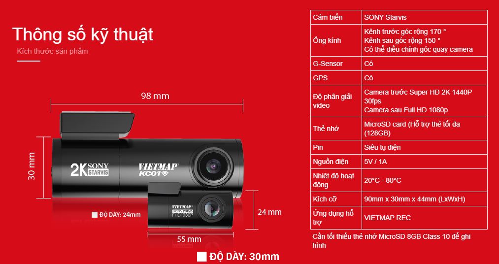 Camera ghi hình trước và sau xe KC01 với camera trước độ phân giải SUPER HD 2K kết hợp cùng camera sau Full HD 1080p trang bị cảm biến ảnh Sony Starvis, ghi lại chi tiết toàn bộ hành trình trước & sau xe cùng với tốc độ