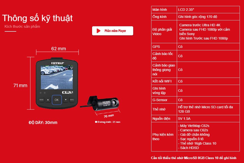 Lưu ý: VietMap C62s ghi hình với độ phân giải Full HD khi ghi hình cùng lúc trước sau.