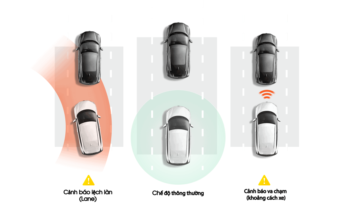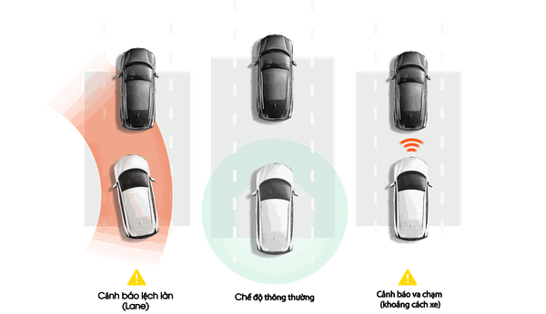 Hệ thống cảnh báo chệch làn đường sẽ cảnh báo khi bạn chạy với tốc độ trên 60km/h, khi đó xe của bạn bắt đầu đánh lái chệch làn. Cảnh báo xe phía trước di chuyến là khi xe của bạn dừng phía sau một xe khác cũng đang dừng. xe phí trước di chuyển camera sẽ cảnh báo cho bạn biết. Cảnh báo khoảng cách với xe phía trước là khi xe bạn tiết sát xe phía trước hoặc xe của bạn bị xe khác tạt đầu camera sẽ cảnh báo để ngăn va chạm với xe phía trước có thể xảy ra.