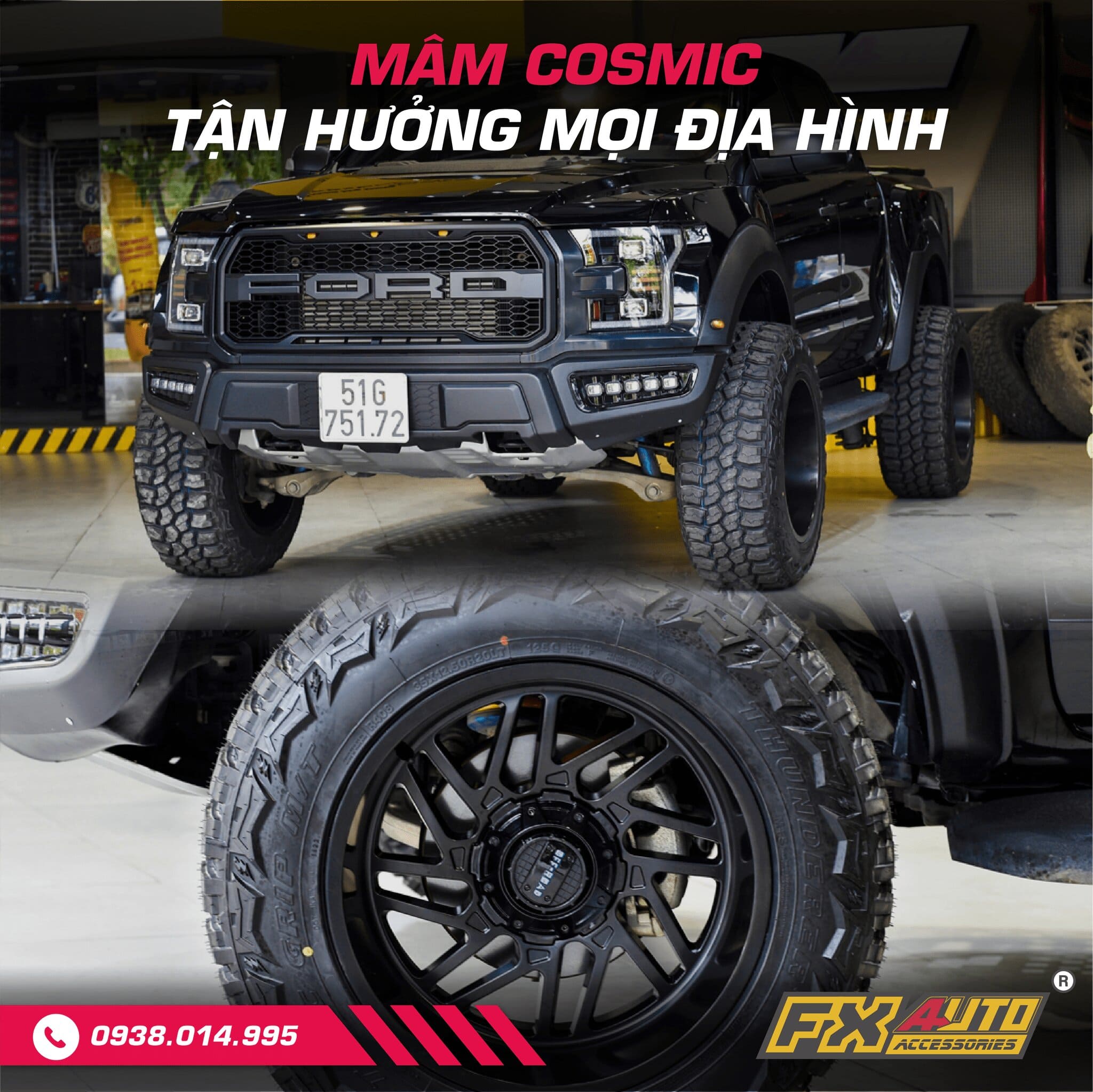 Với mâm Cosmic, bạn có thể tận hưởng mọi địa hình một cách tự tin và đáng tin cậy. Tận hưởng sự phối hợp hoàn hảo giữa phong cách và hiệu suất mà mâm Cosmic mang lại cho chiếc xe FORD RANGER RAPTOR F150.