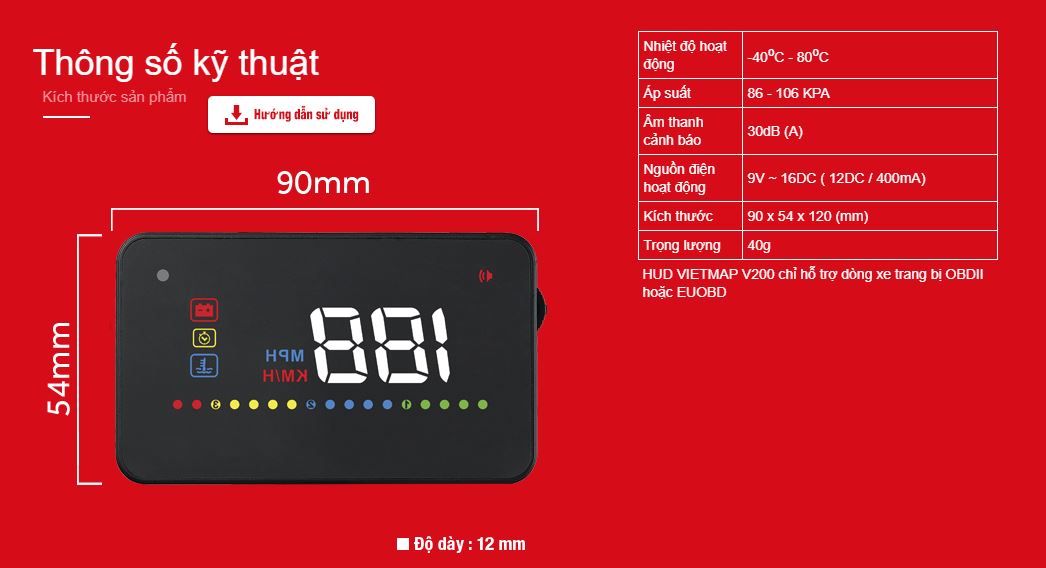 Màn hình hiển thị thông tin trên kính lái HUD V200 thiết kế đơn giản, dễ theo dõi, dễ quan sát giúp tập trung lái xe, và kiểm soát tốc độ tốt hơn.