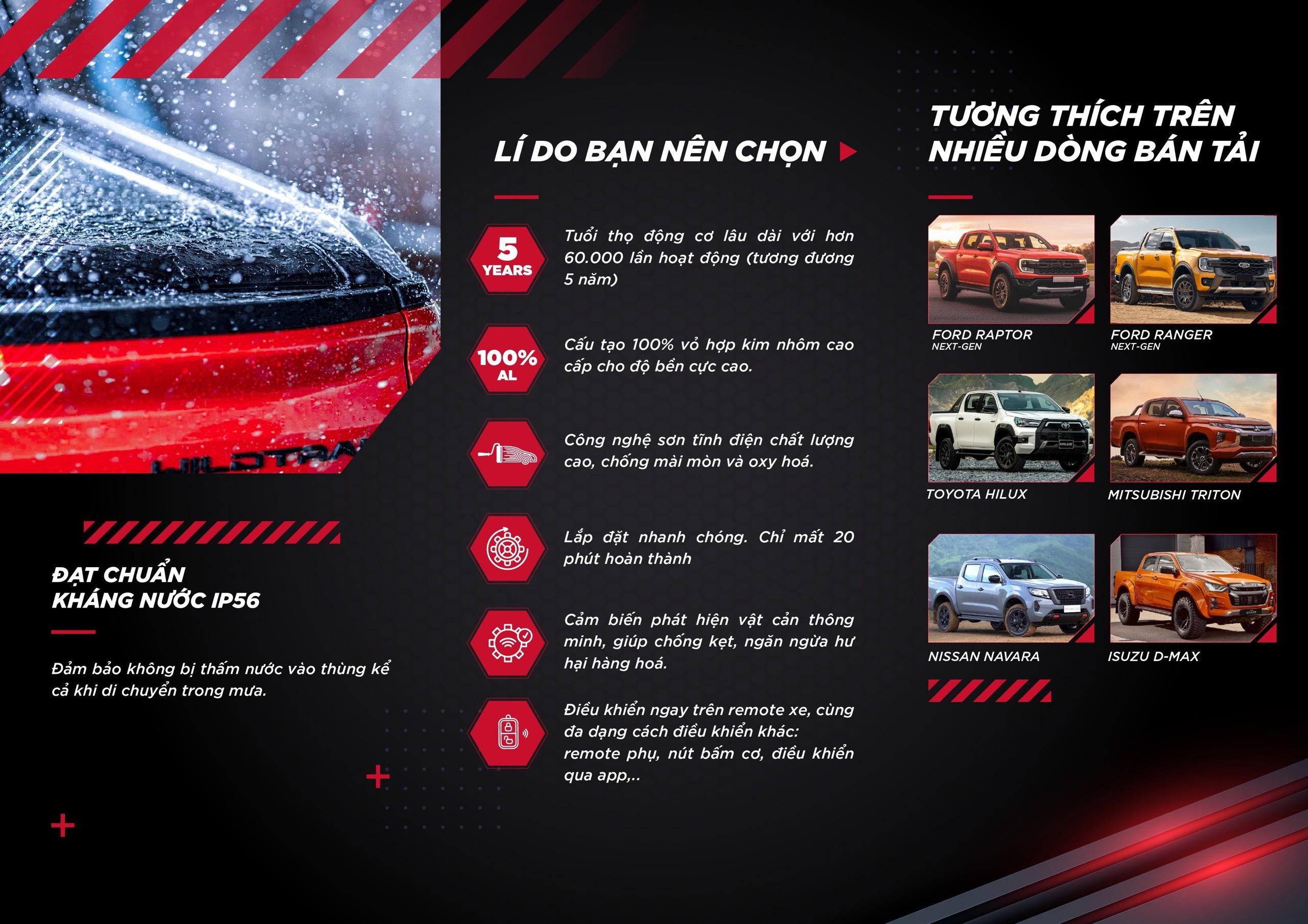 Nắp thùng cuộn điện TyranX là một sự lựa chọn tuyệt vời cho các dòng xe bán tải như Ford Ranger, BT50, Hilux, Colorado, Navara, Triton, và Dmax nhờ vào những đặc điểm nổi bật sau: