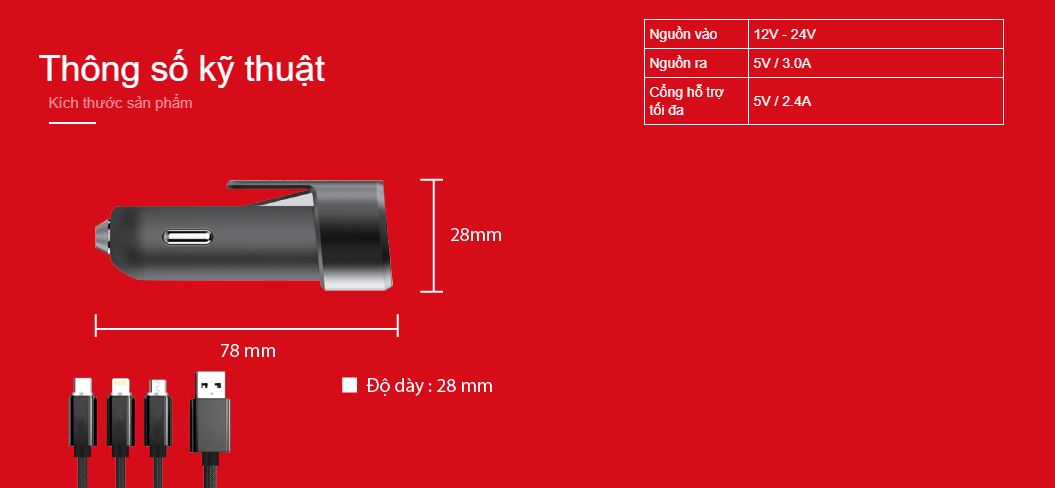 Tẩu sạc thoát hiểm đa năng VM31 với thiết kế dây nguồn thông minh 3 TRONG 1 hỗ trợ tương thích nhiều chuẩn kết nối thiết bị khác nhau: